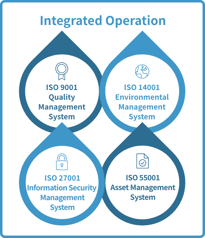 Since obtaining ISO 9001 certification for some departments in 1998, Nihon Suido Consultants has also obtained ISO 14001, ISO 27001, and ISO 55001 certifications, and began operating as a management system integrating the four ISO standards in 2019. In 2022, we acquired certification of Integrated Management System that covers the entire company.